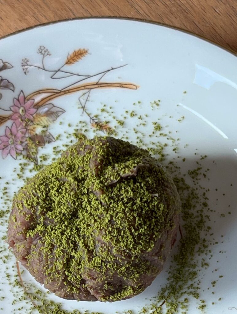 La Kombu a cuit avec des azukis français pour la fabrication d’une pâte anko parfumée de vanille gousse et sucrée de dattes, qui a accompagné de sa douceur l’astringence d’un thé vert, à la manière d’un wagashi !
